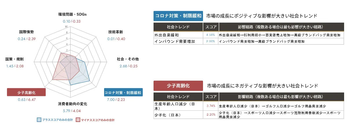 今後5年間でファッション雑貨メーカーに影響する市場環境の変化を8つのカテゴリーに分類すると、プラス要因としてはコロナ対策・制限緩和、一方マイナス要因としては少子高齢化の影響が大きいと予測する。プラス要因であるコロナ対策・制限緩和の具体的な要因は、外出自粛緩和やインバウンド需要増加と予測する。マイナス要因である少子高齢化の具体的な要因は、生産年齢人口減少(日本)や少子化(日本)と予測する。