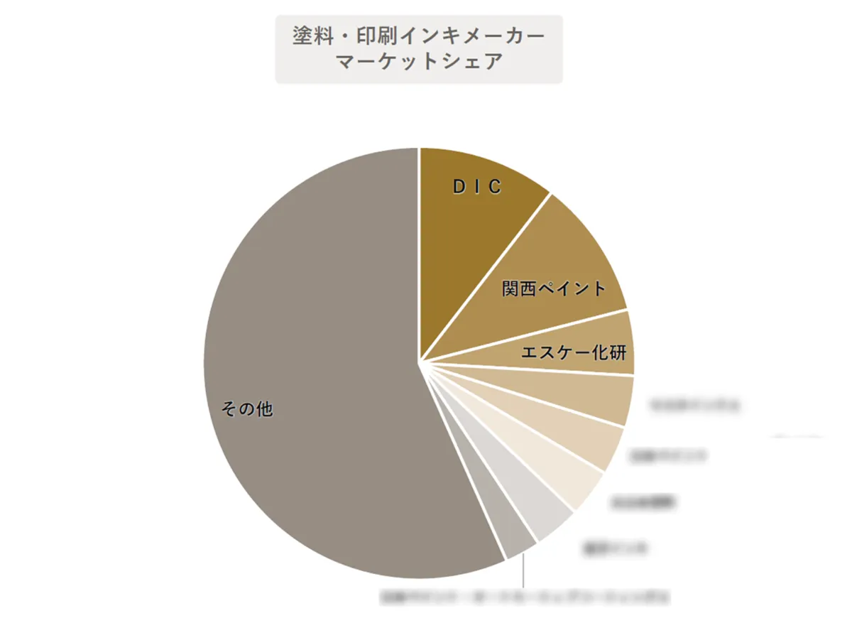 国内市場の主要プレイヤーとして、印刷インキ、カラーフィルタ用有機顔料などで世界トップシェアを誇るDIC、自動車用塗料で国内トップシェアを誇る関西ペイント、壁用の建築塗材に強く、建築仕上材でトップシェアを誇るエスケー化研が上位にランクインした。