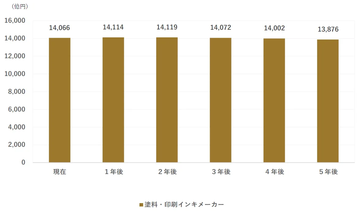 塗料・印刷インキメーカーの国内市場規模は、現在の1兆4,065億円から、今後5年間で1.35%縮小し1兆3,876億円に減少すると予測する。また、時系列で見ると、5年後、4年後の縮小が比較的大きいと予測する。
